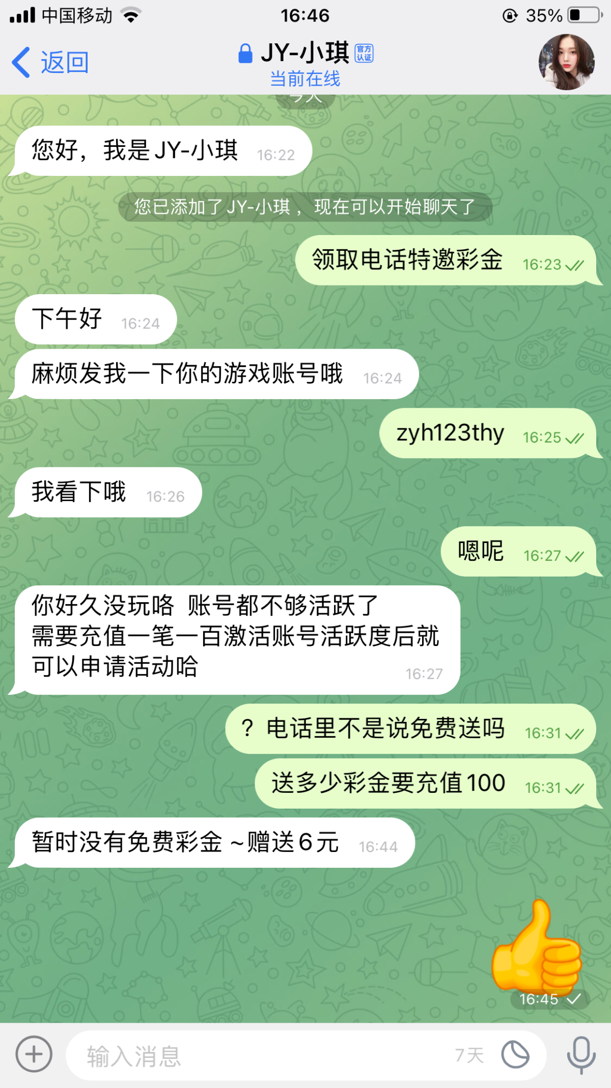打电话说登录就有不需要充值,结果没有这回事问客服叫你充值