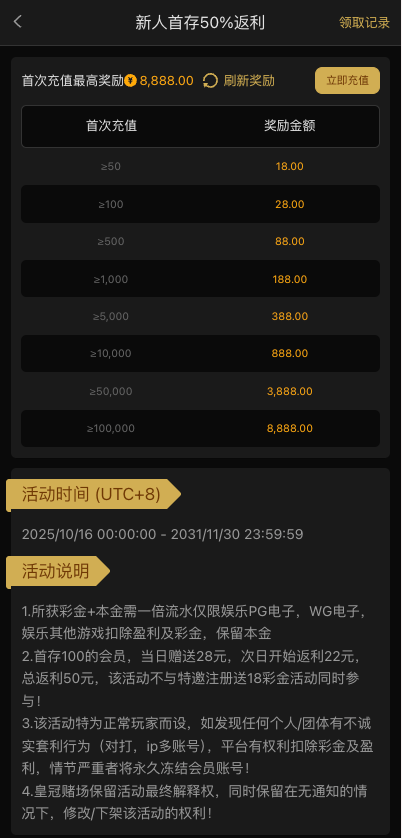 新人大礼包二:新人首存50%返利
