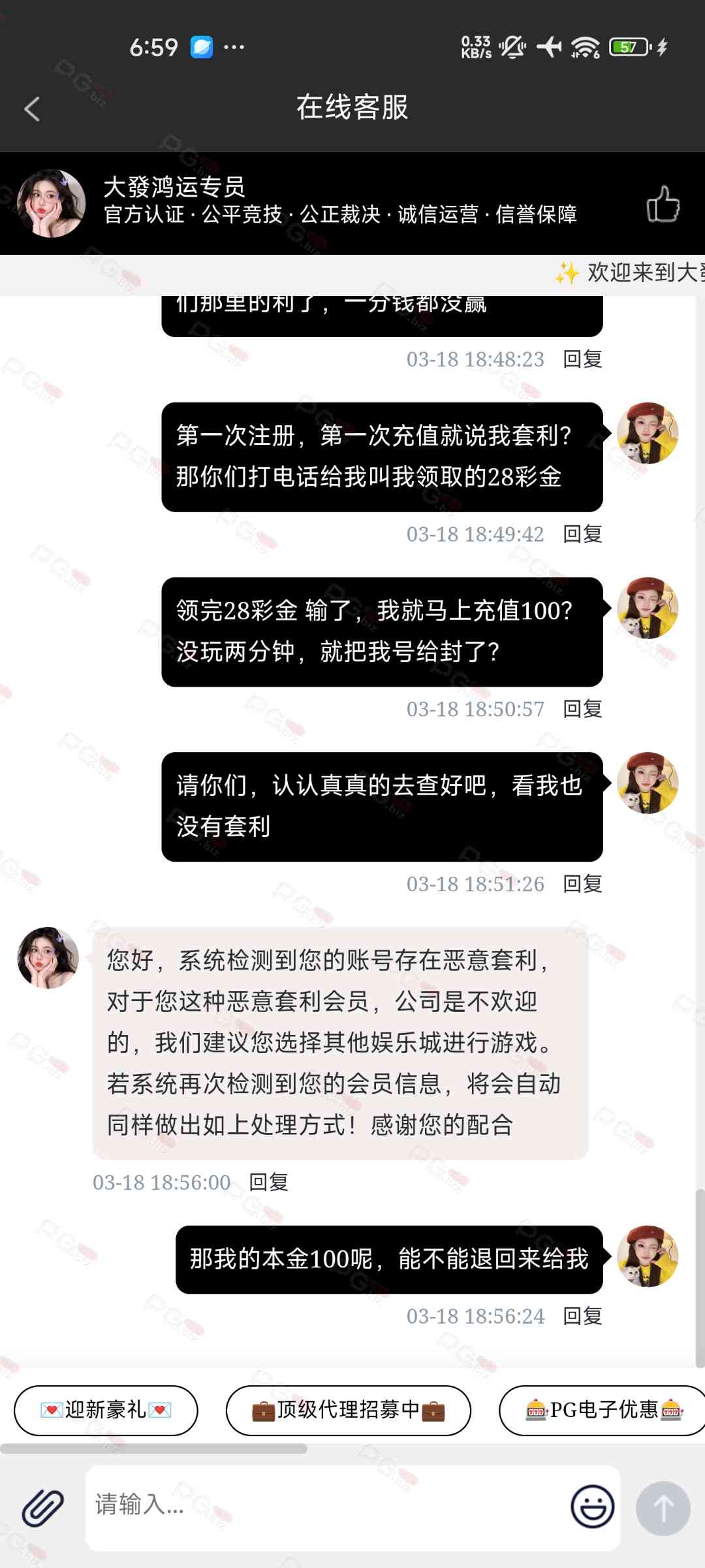 事情的经过是这样子的,看见有老哥发那个电话特邀,然后我就领了28彩金玩,输了我又充值了100块钱进去,才玩了两分钟。把我的账号给封了,说我套利,我套他老母嗨,连本金也不退回来给我