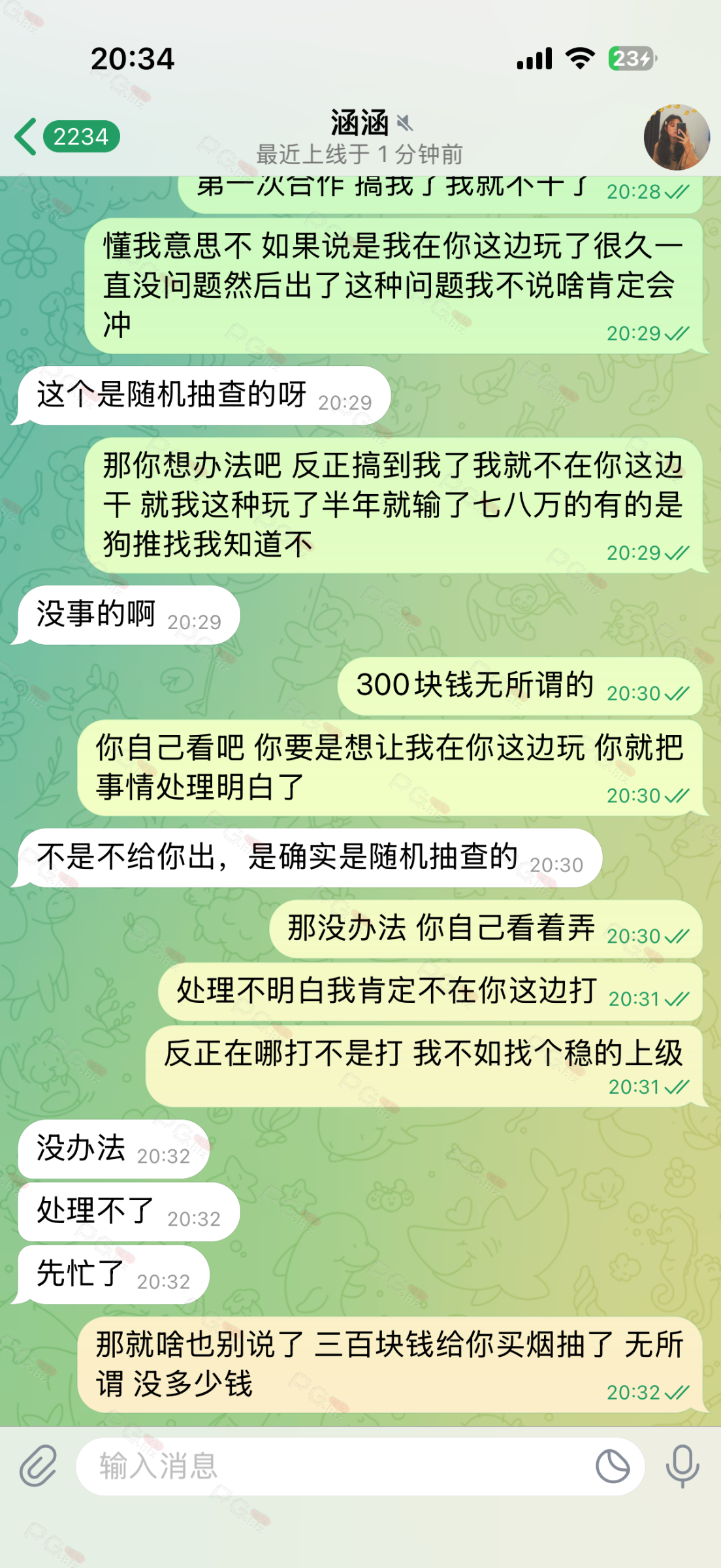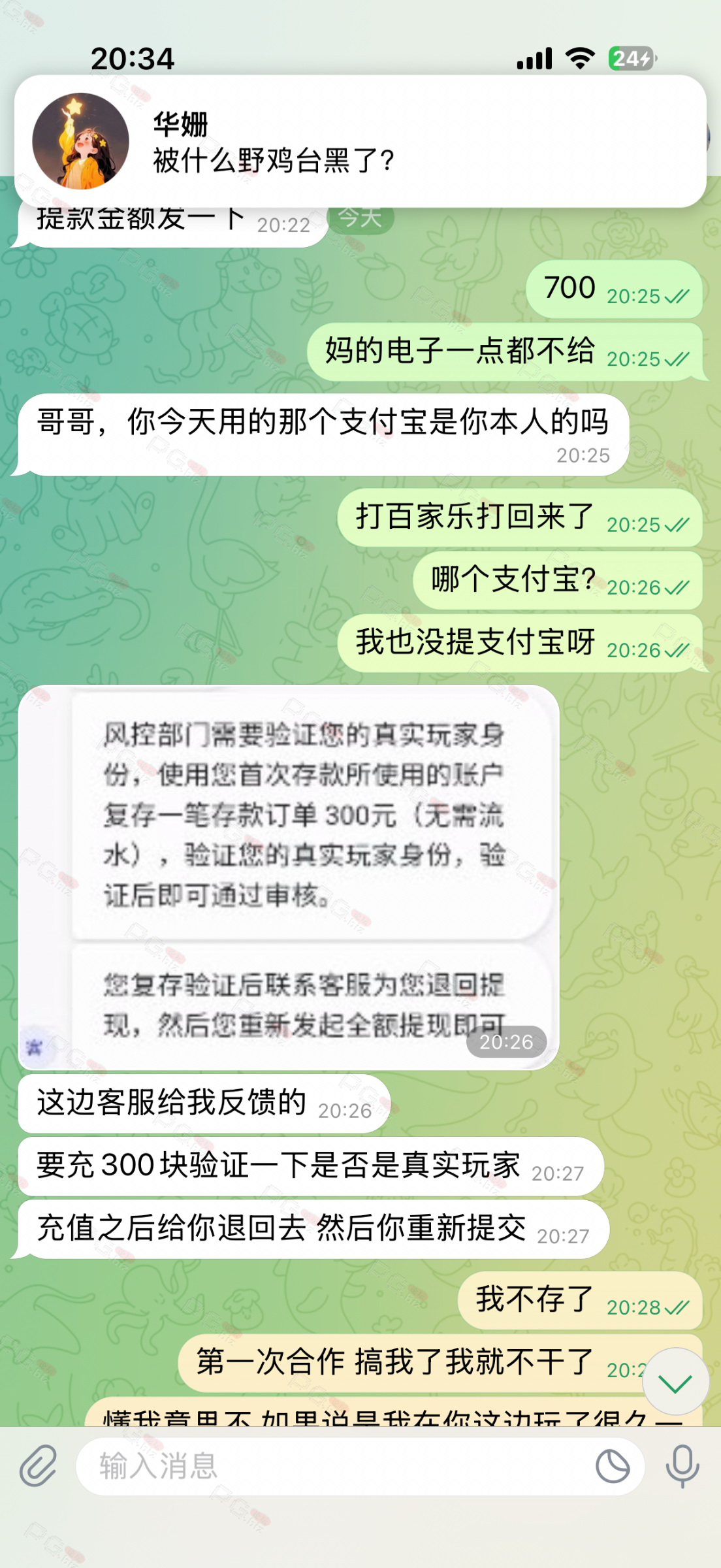 让我首存300送488 然后呢充值了就送了150 这个咱就不说了 然后所有要求达标了之后提现700一直卡通道 然后去问客服说啥让我再冲300 死黑台 要黑就别黑我几百块啊 有啥意思真是搞不懂了活不起了是吗